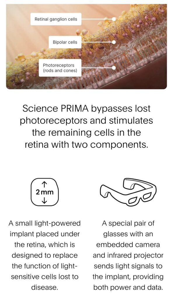 Unlike older systems such as the Argus II retinal implant, which relied on external wires and bulky hardware, the PRIMA System is: