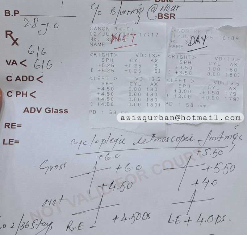 However, DRY autorefraction revealed +3.50D in the right eye and +3.00D in the left. WET autorefraction increased to +5.25D and +4.50D, and cycloplegic retinoscopy confirmed +4.50D (RE) and +4.00D (LE), uncovering significant LATENT HYPEROPIA of +1.0 DS. The patient had unknowingly compensated for years with strong accommodation, leading to fatigue and symptomatic strain. After a PMT, I applied a clinical rule of thumb that I find invaluable. “CORRECT THE DISTANCE VISION FIRST THE NEAR WILL OFTEN TAKE CARE OF ITSELF.”
