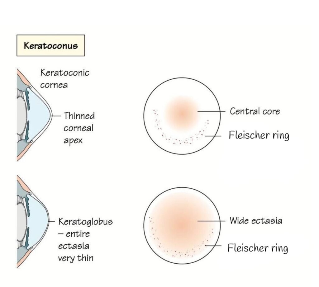 - The Fleischer ring appears in keratoconus due to iron deposits (hemosiderin) in the corneal epithelium.