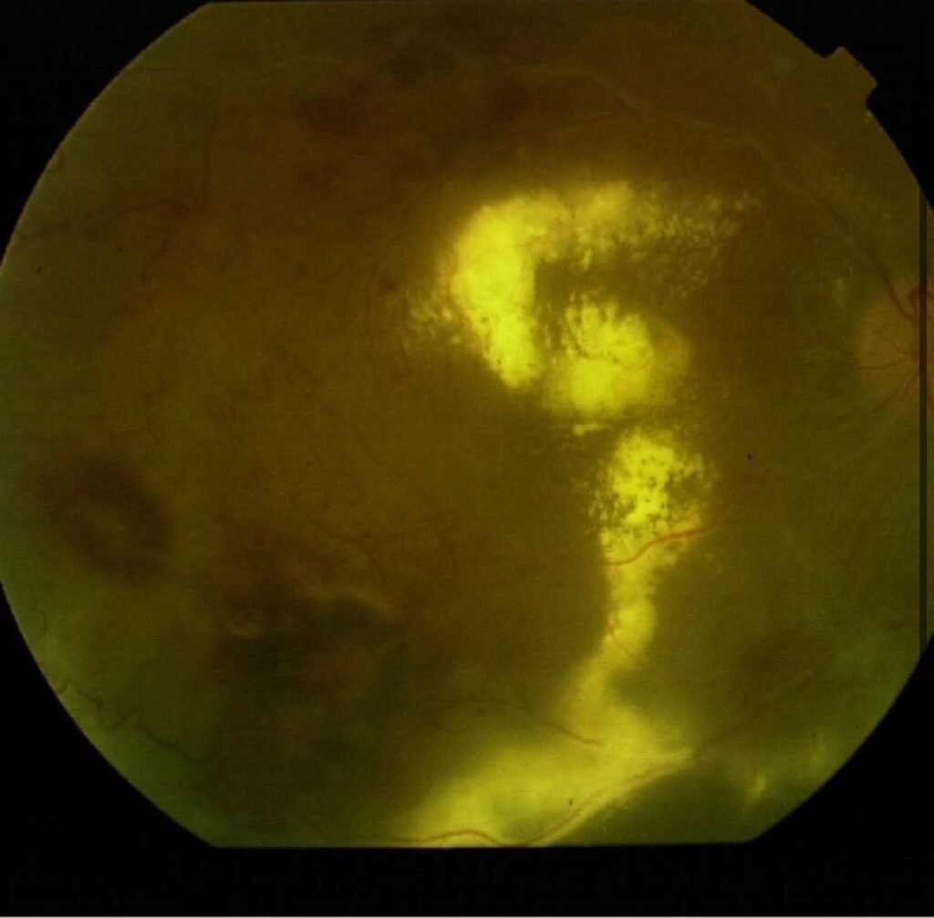 The patient in this case—shared by Dr. Gil Calvão-Santos—was a woman in her 40s who presented with sudden vision loss in the right eye. The examination revealed a vitreous hemorrhage, a hallmark of the proliferative stage of Eales disease. Interestingly, she had asymmetrical disease, with her right eye more severely affected, resulting in significantly reduced vision.