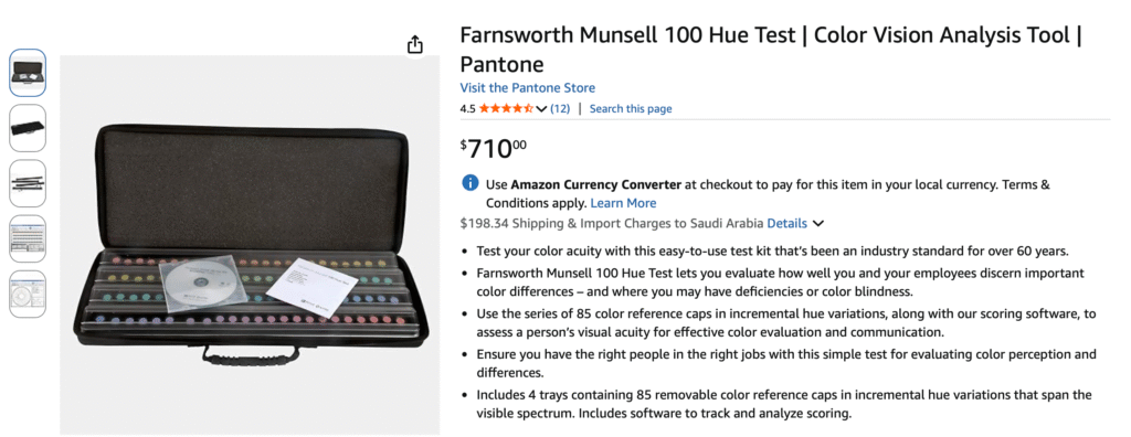 The price of Farnsworth Munsell 100 Hue test for clinic- $710 (amazon link) which we are offering for FREE along with pdf report and result analysis.