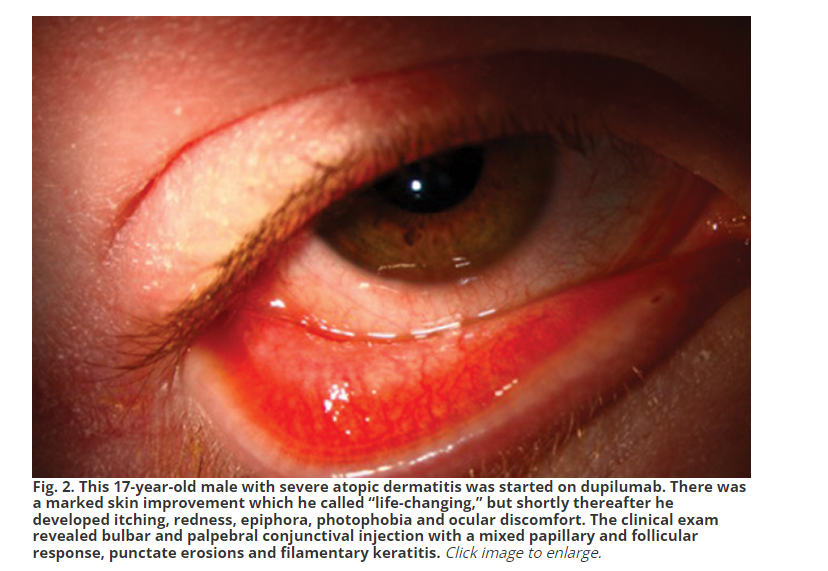 Since its debut, use of this drug has continued to climb due to its clinical success and increasing list of indications. Many severe cases of atopic dermatitis otherwise recalcitrant to treatment have shown significant skin improvement with dupilumab. Therefore, these patients are often reluctant to discontinue this life-changing therapy. In most cases, management of the ocular surface complications can allow a patient to continue their systemic treatment.