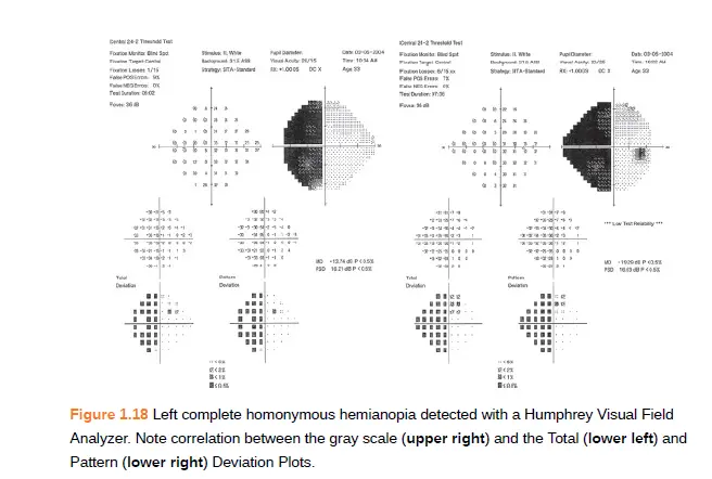 - Homonymous hemianopia: A nasal field loss in one eye with a temporal loss in the other points to a retrochiasmal lesion.