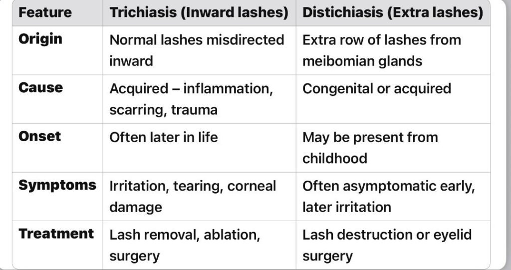 Both trichiasis and distichiasis can lead to chronic eye irritation and potential corneal complications if left untreated. Trichiasis arises from misdirection of normal lashes, while distichiasis involves an abnormal extra row of lashes. Early diagnosis, regular monitoring, and timely treatment are essential to prevent long-term damage and preserve vision.