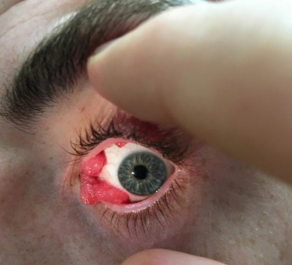 It typically appears as a fleshy, pink, lobulated, raspberry-like growth on the conjunctiva.