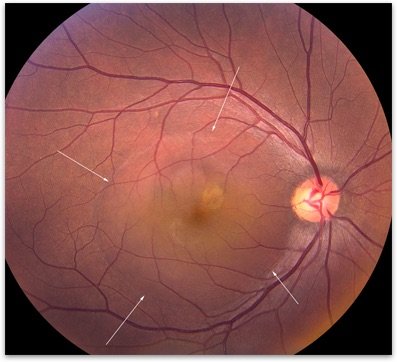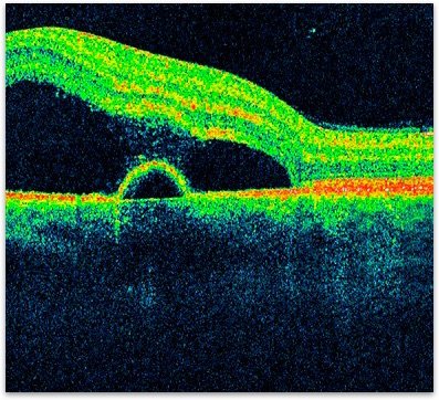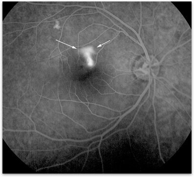 CSR can often be readily diagnosed by a dilated eye exam and confirmed through the use of specialized testing. In the early active stages of the disease a small retinal detachment can be seen on examination (figure 1). Optical coherence tomography (OCT) is used to quantify how much fluid is under the retina in CSR (Figure 2). This technique is helpful not only in documenting the quantity and location of fluid collections but also in following the resolution of fluid during healing or after treatment. The fluid that accumulates under the retina typically leaks from a small point under the retina. A fluorescein angiogram can be used to diagnose the condition and identify the location of the leaking fluid (figure 3). A leaking point of fluid on a fluorescein angiogram is the hallmark feature of the disorder. In more chronic disease, signs of previous episodes of active CSR are often detected by the retina specialist and sometimes can be seen in both eyes. Not all of these previous episodes will have caused symptoms, however.