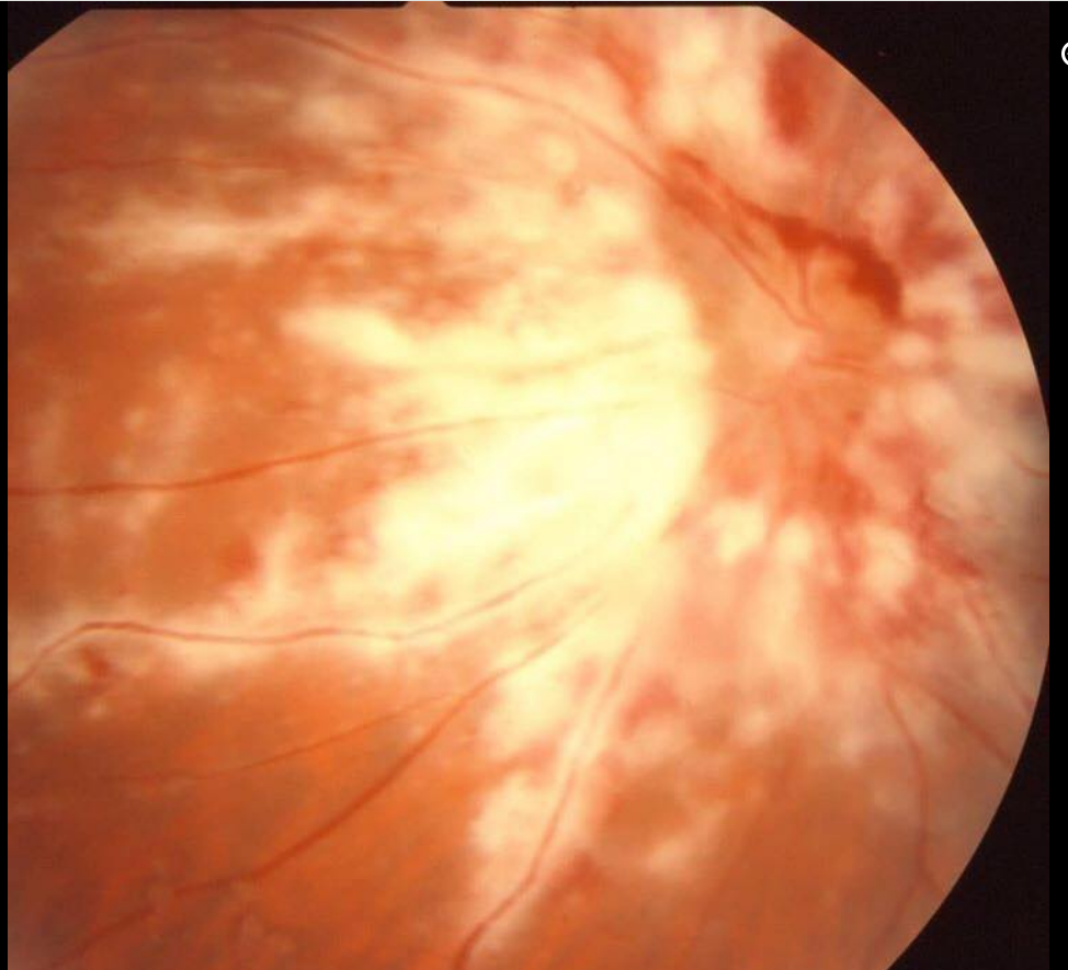 - Appearance: Posterior lesions present as large areas of thick white infiltrate along retinal vessels, often accompanied by hemorrhage, resembling a “pizza pie” or “cheese pizza.”