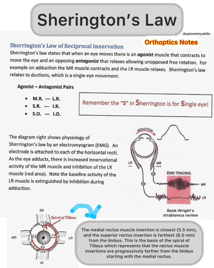example on adduction the MR muscle contracts and the LR muscle relaxes. Sherrington’s law